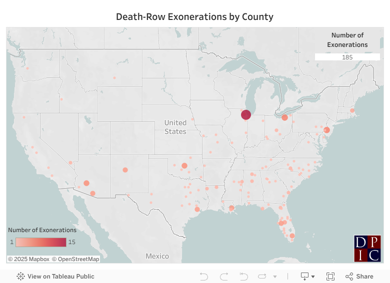 26 counties have more than one death-row exoneration, collectively accounting for 50.3% of all of the wrongful capital convictions that have resulted in exonerations.