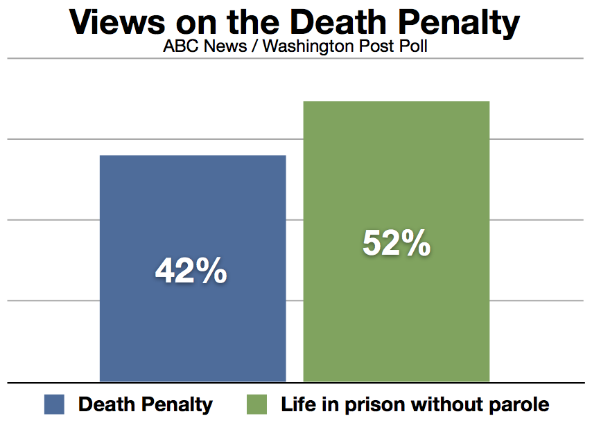- When given the alternative of life without the possibility of parole, the percentage of Americans favoring the death penalty drops to 52%.