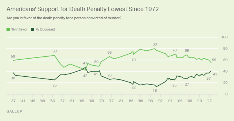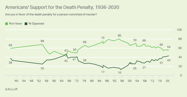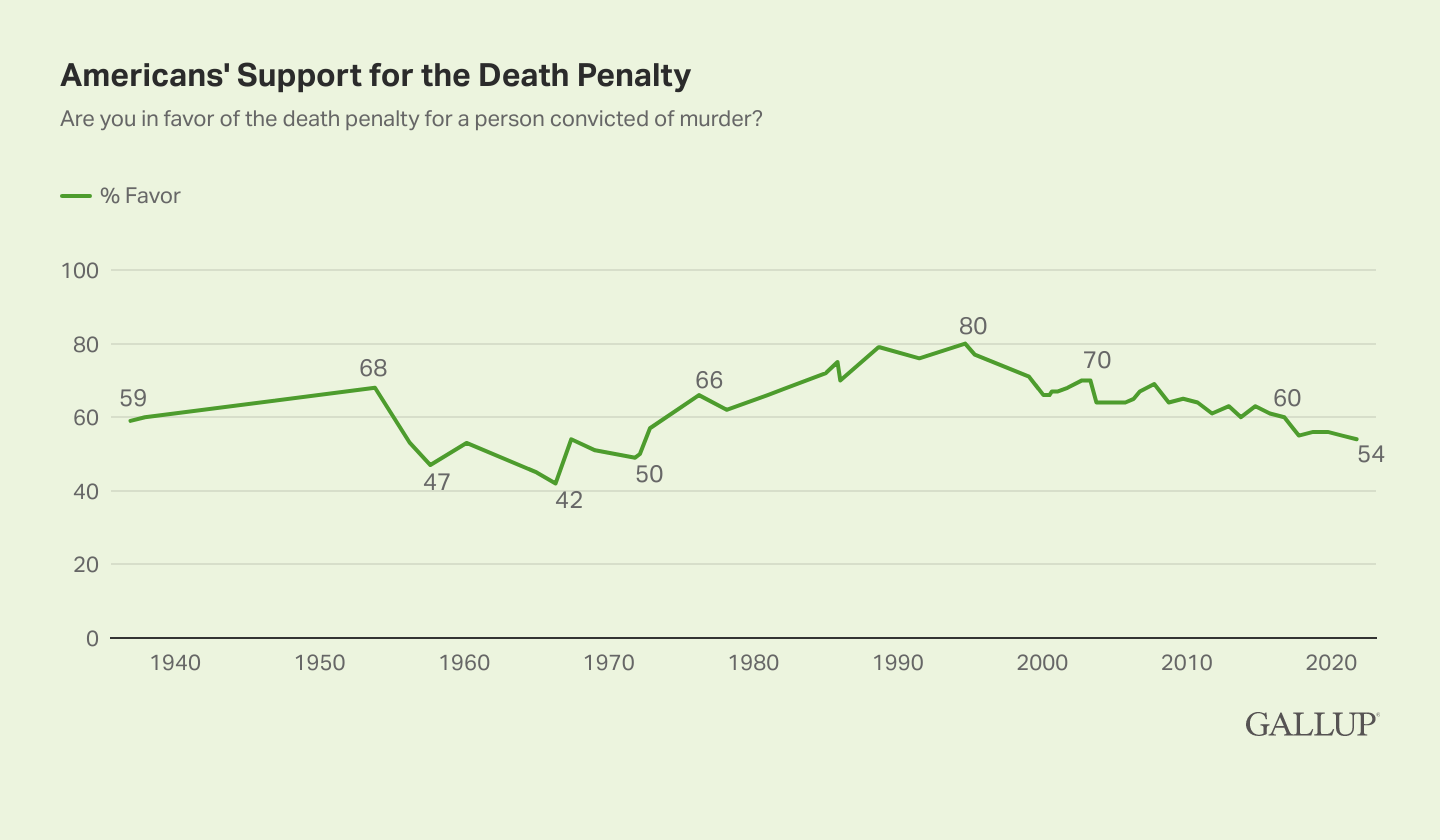 - 74% of Americans support the death penalty when asked: “Are you in favor of the death penalty for a person convicted of murder?”