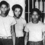 Charles Greenlee, Ernest Thomas, Walter Irvin, and Samuel Shepherd were charged with raping 17-year-old Norma Padgett. Thomas escaped from custody but was hunted down and murdered by an angry mob. He was reportedly shot 400 times. White mobs burned and shot at the homes of black families, many of whom fled and never returned. Greenlee, Irvin, and Shepherd were beaten until they falsely confessed to the crime. All-white juries convicted them, sentencing World War II veterans Irvin and Shepherd (pictured, right) to death and Greenlee (pictured, left), who was only 16 years old, to life in prison.