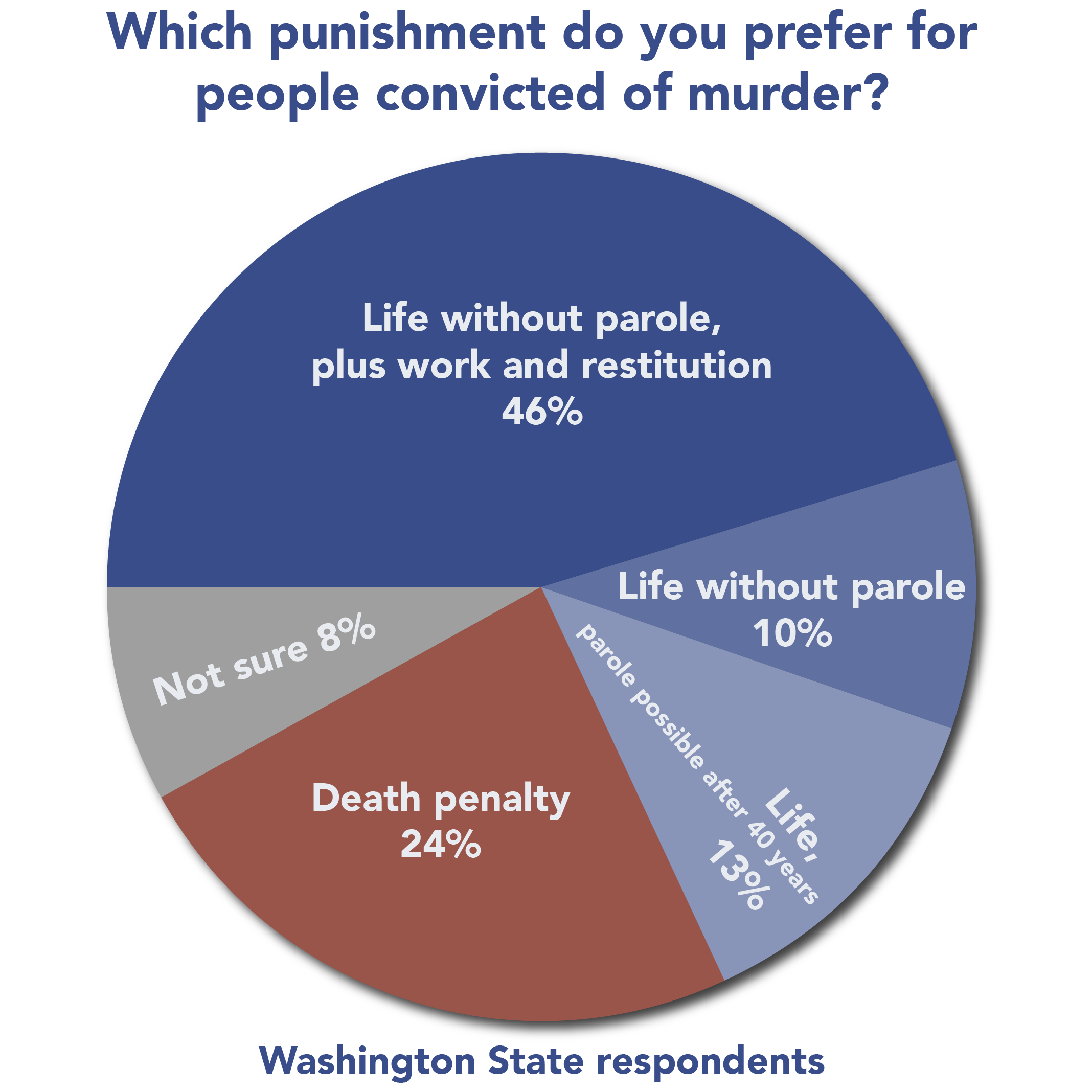 - A July 2018 poll of likely voters, commissioned by theNorthwest Progressive Institute (NPI) and conducted by Public Policy Polling, found that 69% of likely voters in the state preferred some version of a life sentence as punishment for people convicted of murder, as compared to 24% who said they preferred the death penalty. The most preferred option was life in prison without parole, plus restitution, which 46% of all respondents supported. An additional 10% preferred life without possibility of parole, while 13% favored life in prison with parole eligibility after at least forty years. 8% said they were not sure.